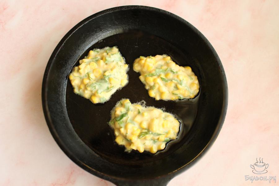 7. На сковороде разогреть растительное масло. Столовой ложкой выкладывать тесто и формировать оладьи. Готовить оладьи до золотистого низа.