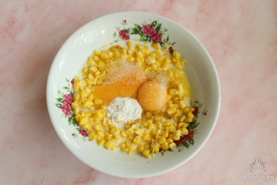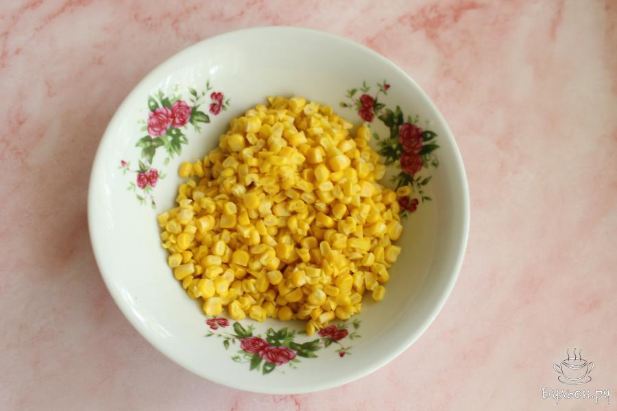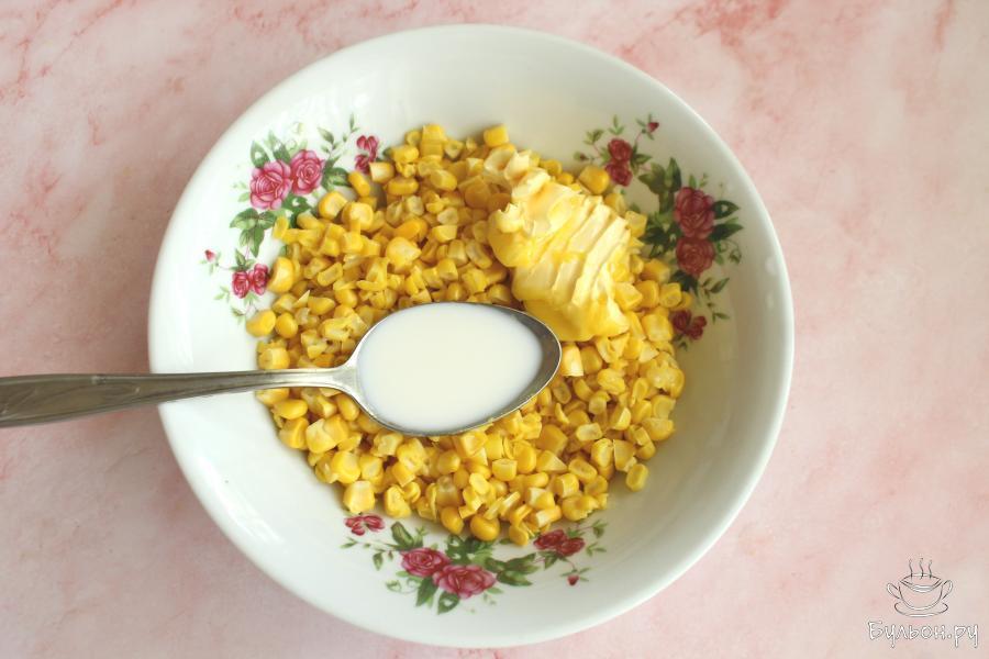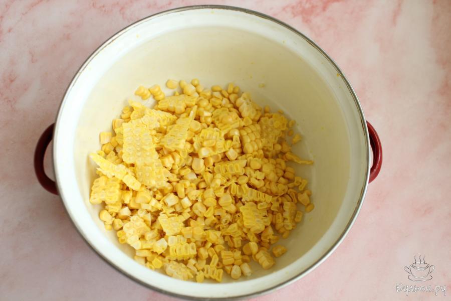 1. Кукурузные зерна срезать с початков и выложить в кастрюльку, залить водой и варить 5 минут после закипания воды.
