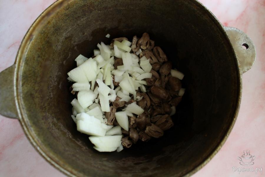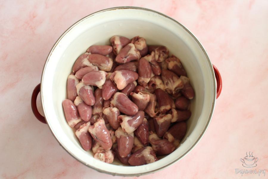 1. Сердечки почистить, промыть, выложить в кастрюльку. Влить 800 мл воды и варить сердечки 10 минут после закипания воды.