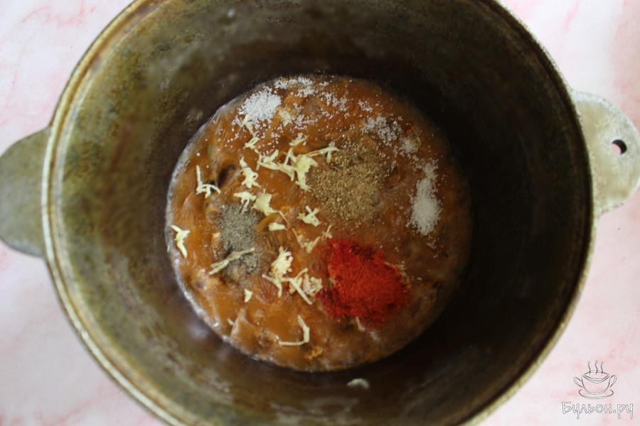 7. Сразу влить в казан 200 мл. воды, перемешать. Добавить хмели-сунели, соль, черный перец, сладкую паприку и продавленный через пресс чеснок. Готовить блюдо еще 5-6 минут.