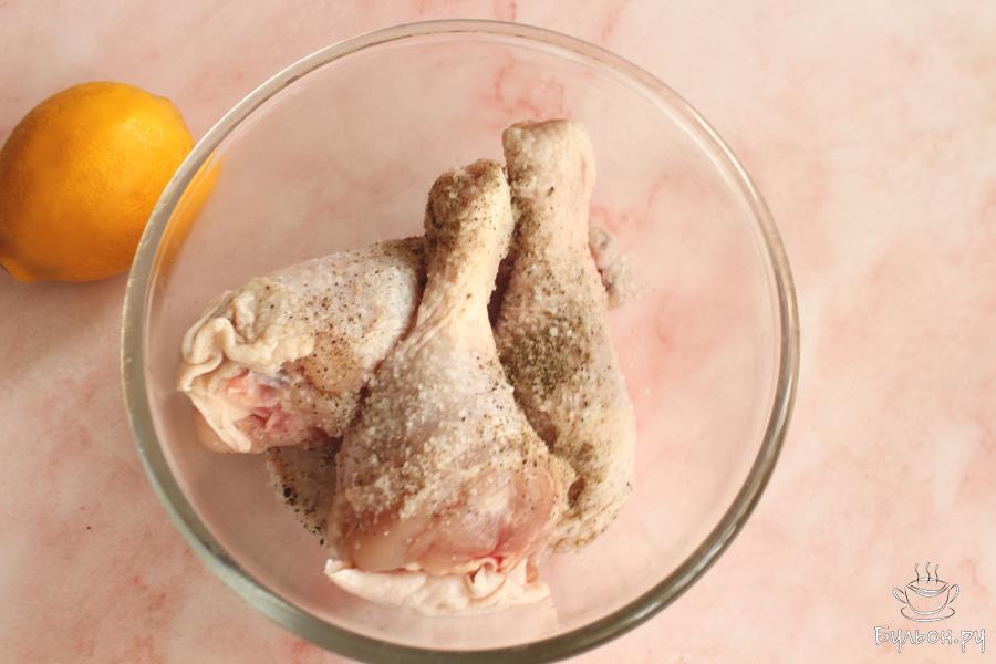 1. Голени промыть, выложить в чашку, добавить соль, черный молотый перец и выжать сок. Перемешать и оставить на полчаса.