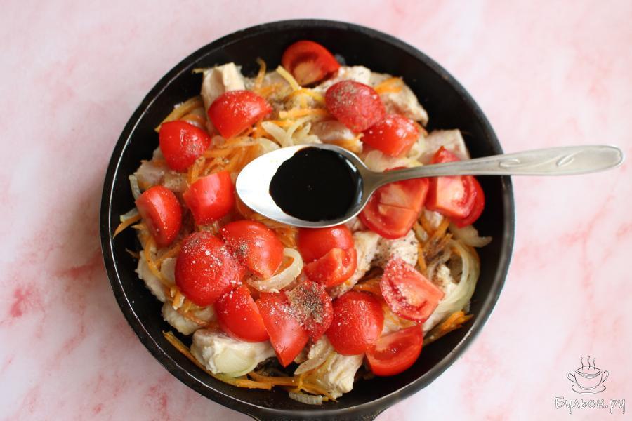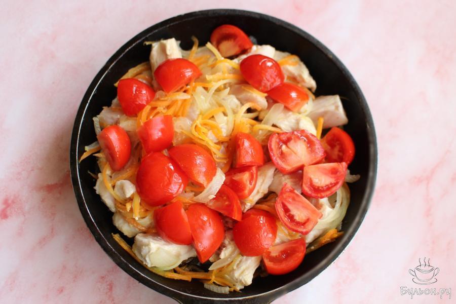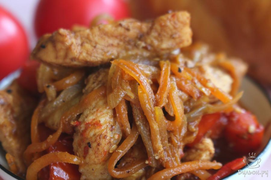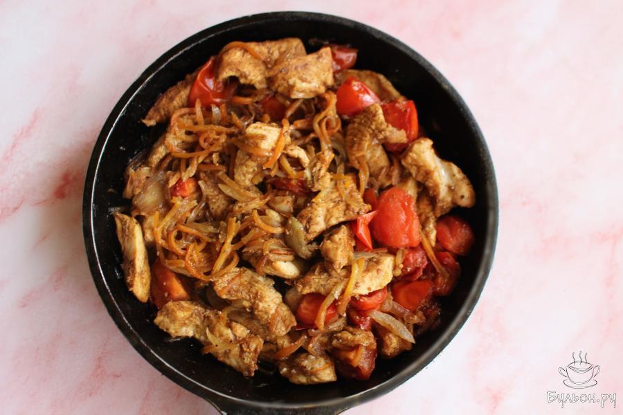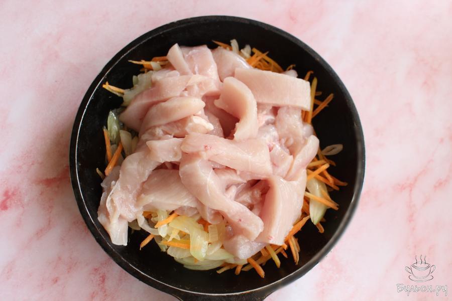 3. Куриную грудку нарезать длинными брусочками, выложить на сковороду и обжарить все вместе 3-4 минуты, помешивать.