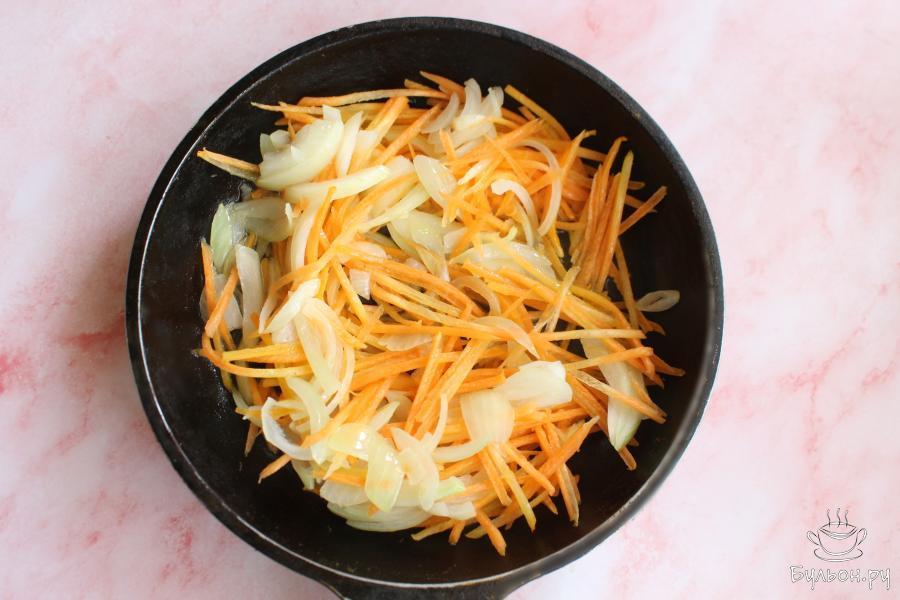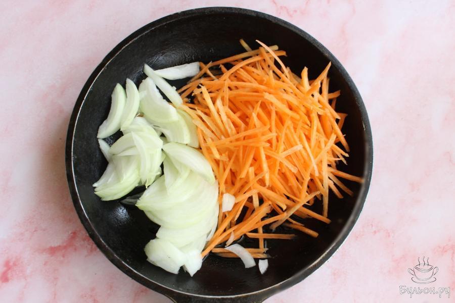 1. Лук нарезать длинными перьями, морковь натереть соломкой через салатную терку. На сковороде разогреть масло и выложить овощи.