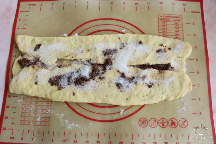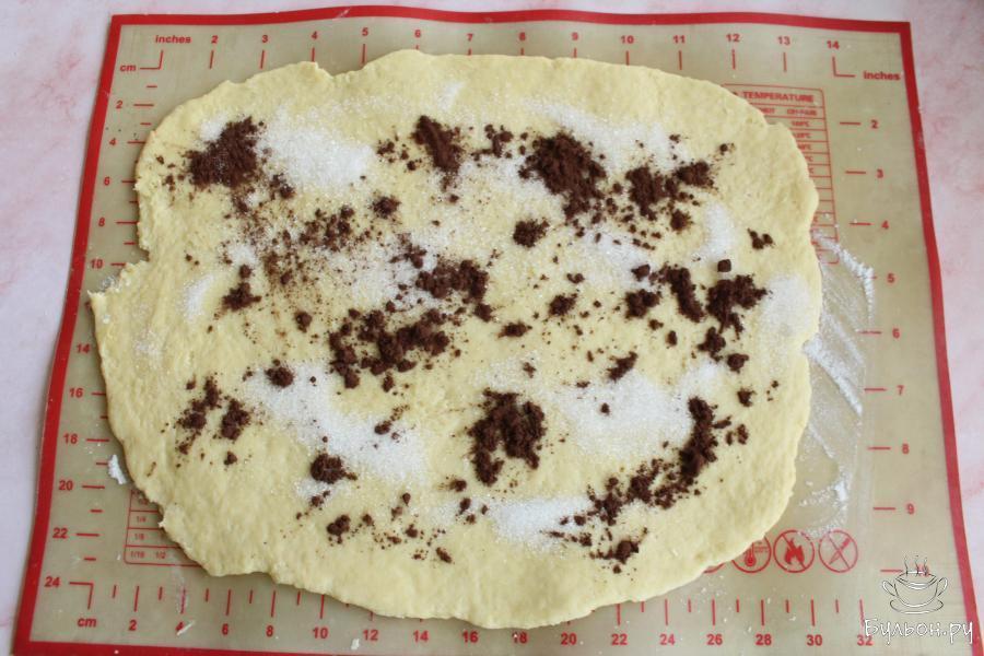 4. Тесто раскатать в прямоугольный пласт толщиной около 4-5 мм. Распределить по тесту половину сахара и какао-порошка.