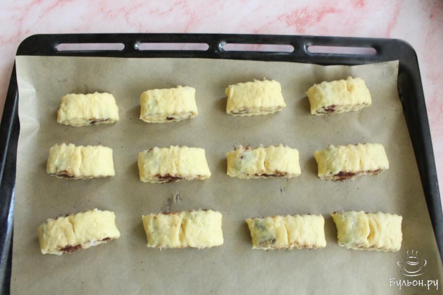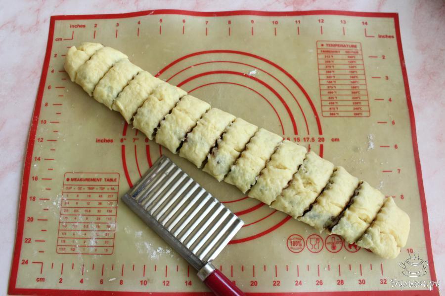 6. Снова сложить края теста к середине и аккуратно залепить края. Нарезать рулет на порционные кусочки. Таким образом можно складывать рулет не два, а три раза, тогда начинку распределите на три части.