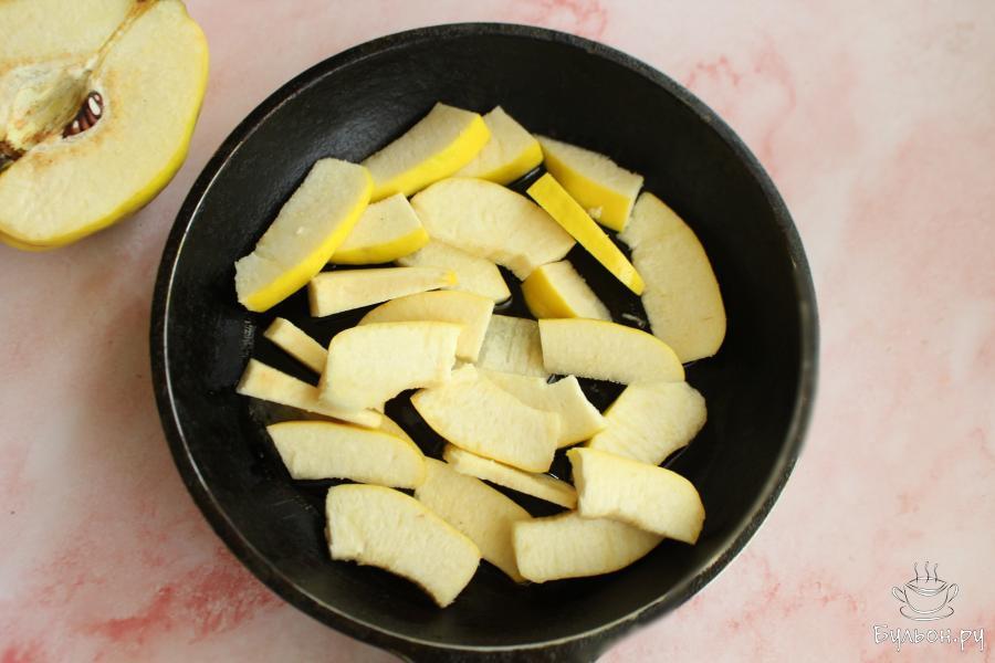 1. Айву тщательно промыть, убрать сердцевинки и нарезать айву тонкими дольками. На сковороде разогреть масло и обжарить айву 3-4 минуты.