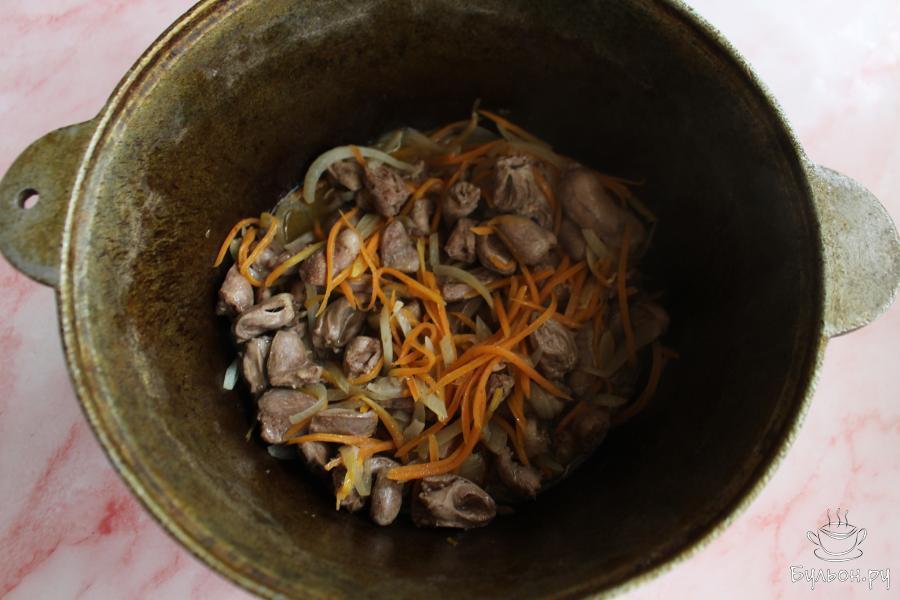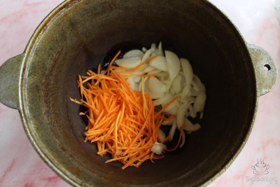 2. Лук нарезать перьями, морковь натереть соломкой через салатную терку. В казане разогреть масло и обжарить овощи минут пять.