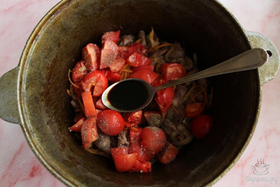5. Помидоры нарезать дольками и выложить в казан. Добавить в казан соевый соус, черный перец и если нужно, то и соль.