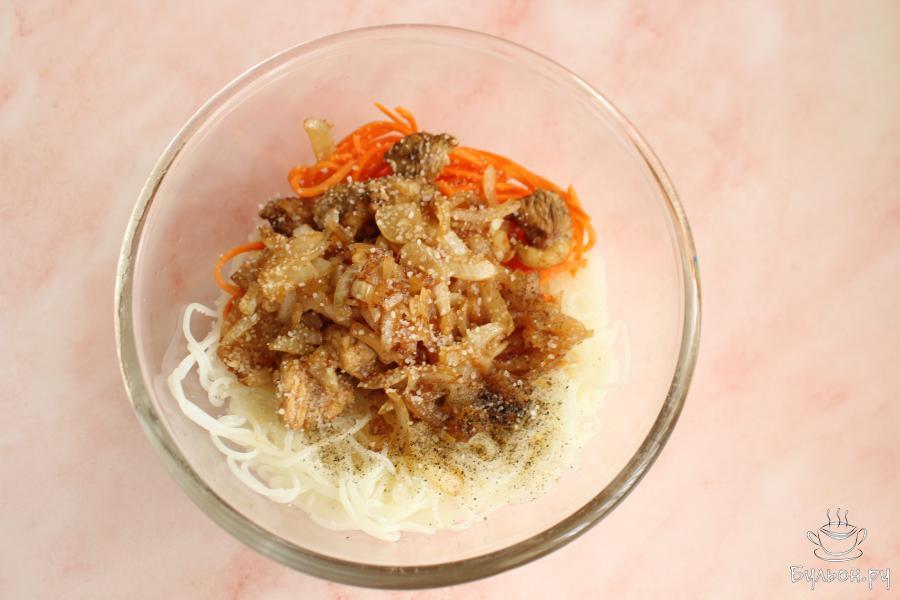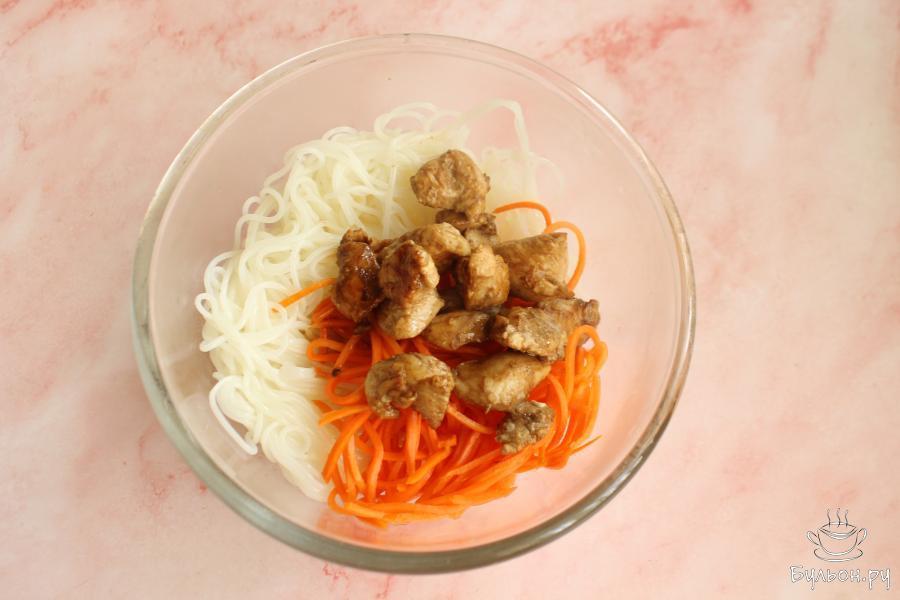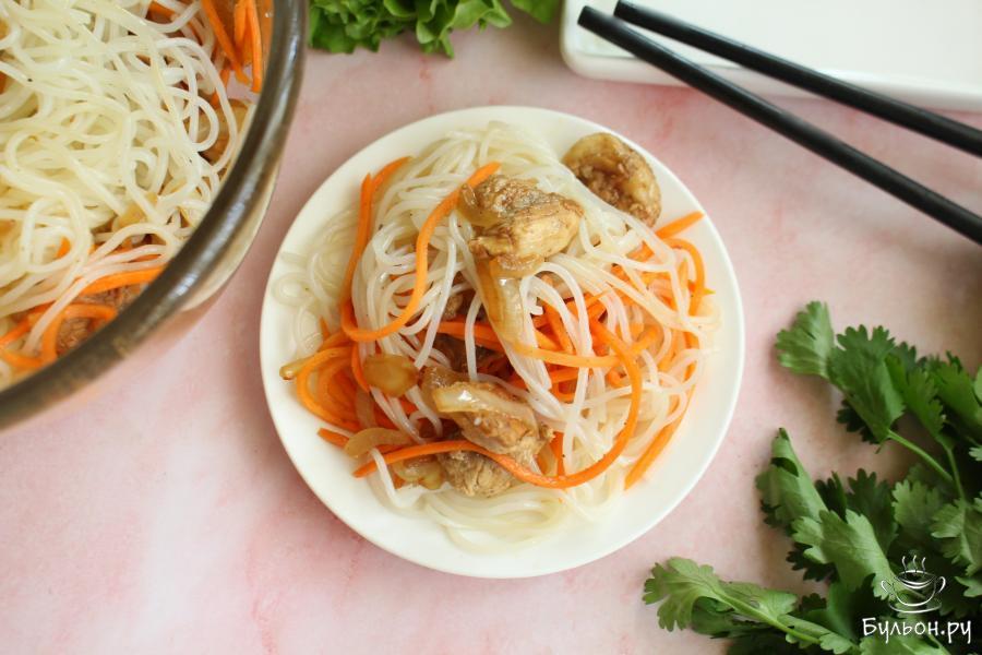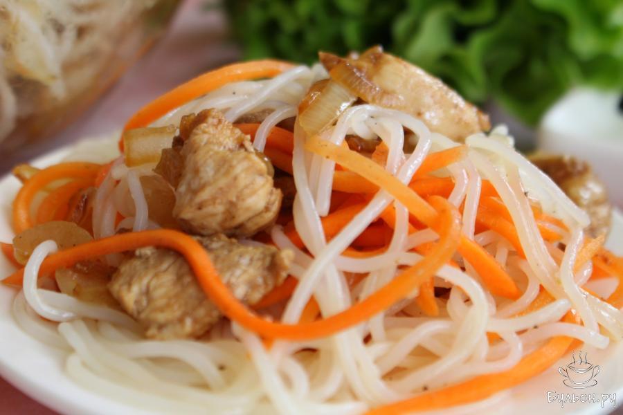 Фунчоза с жареной куриной грудкой хороша тем, что ее можно подать и как основное блюдо, и как закуску, в горячем и в холодном виде. Фунчоза получается сочная, аппетитная, сытная, но и в то же время легкая. Порцией такой лапши с курицей можно заменить обед или ужин. Если вы любите блюда с чесноком и зеленью, то вполне можно добавить в этот салат продавленный чеснок и мелко нарезанную кинзу по вкусу. Количество уксуса и соевого соуса можно увеличить, ориентируйтесь на свои предпочтения.