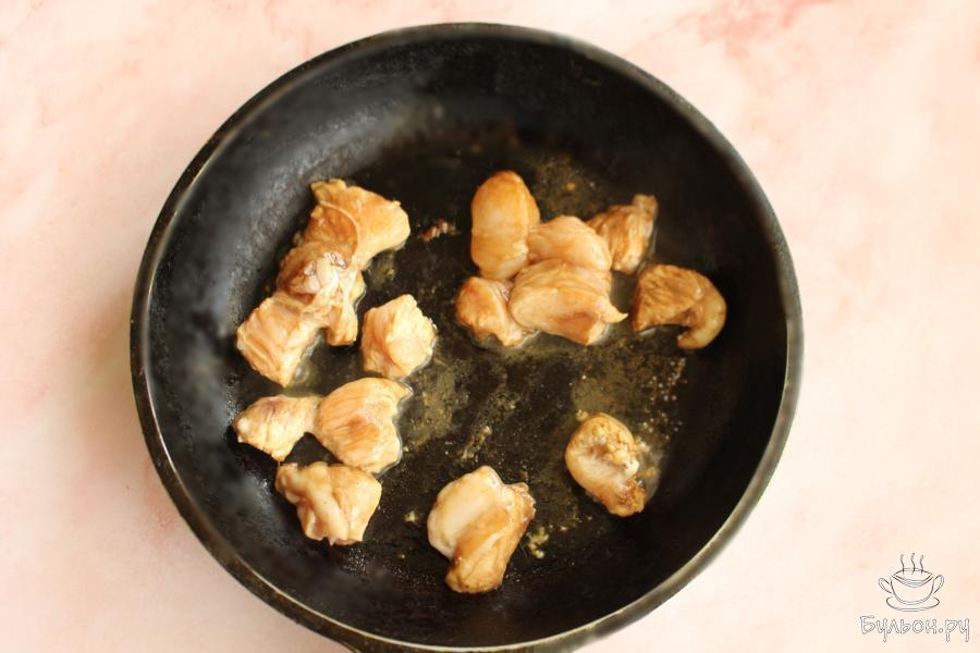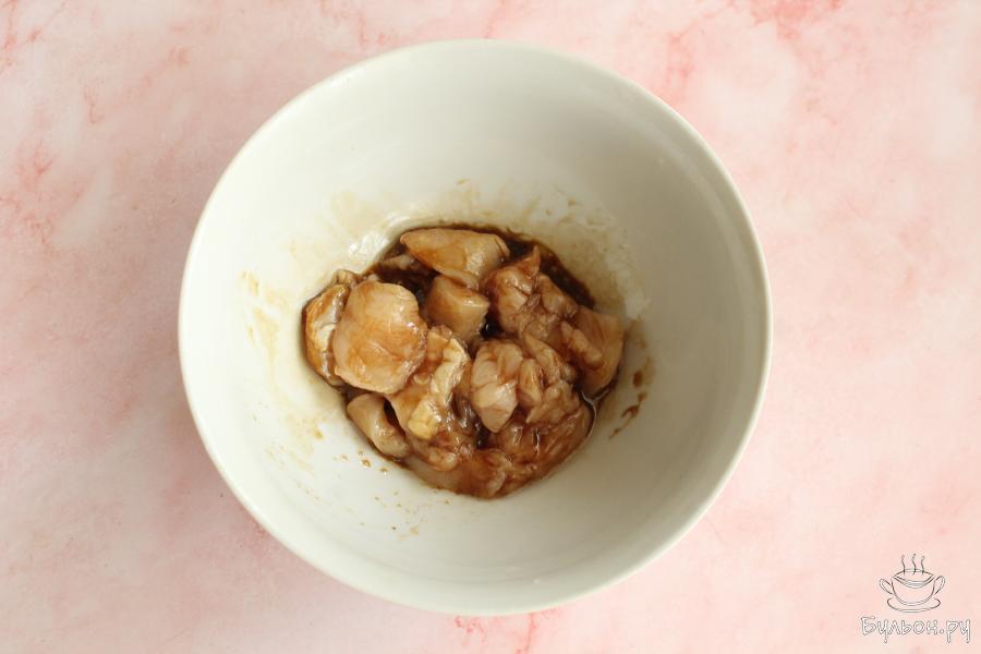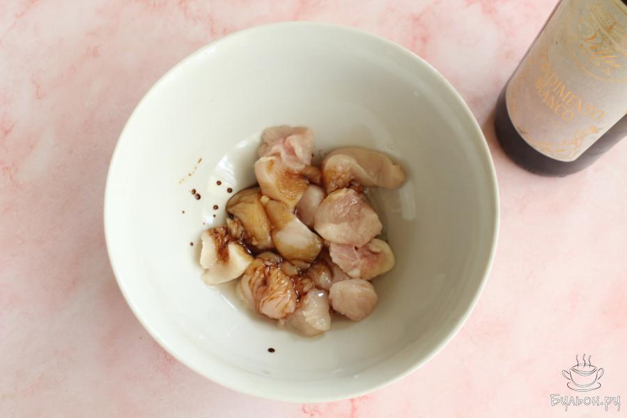 1. Куриную грудку нарезать небольшими кусочками, добавить в чашку белый винный уксус, соевый соус и масло.