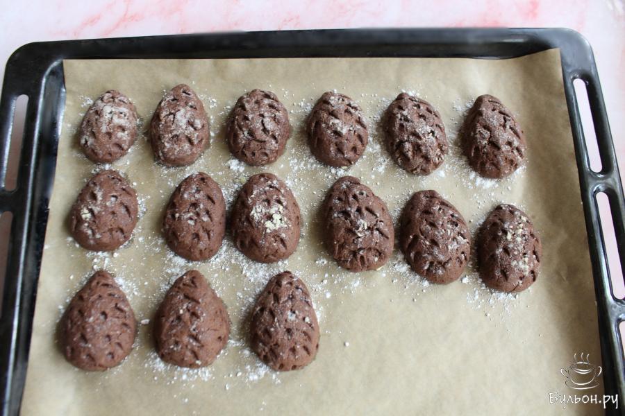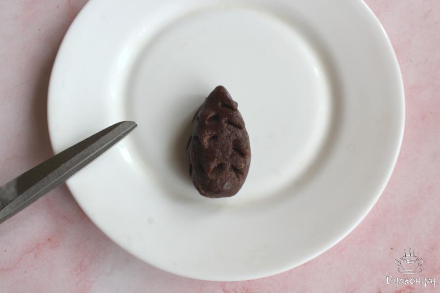 6. Достать одну часть теста и формировать из него печенье в виде капли-шишки. Размер шишек менее, чем мелкое куриное яйцо. Ножницами сделать на печенье неглубокие надрезы в виде чешуек.