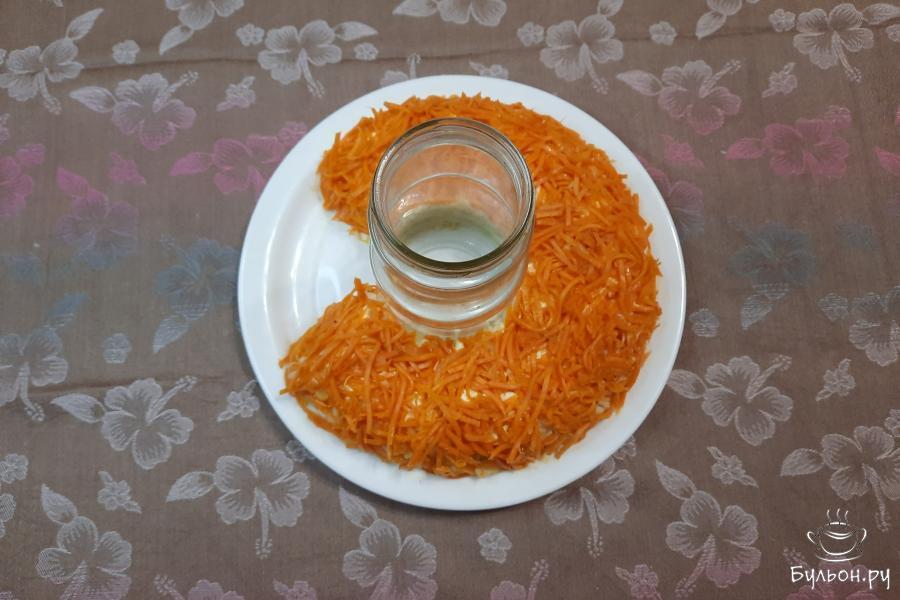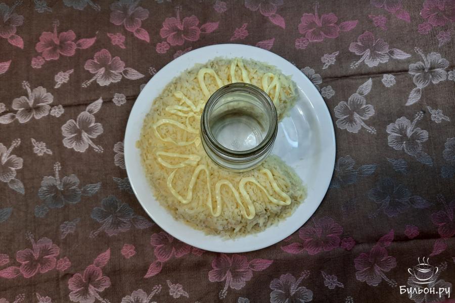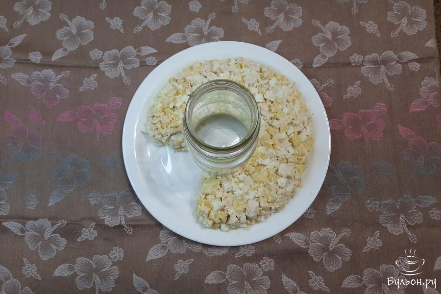 3. В центр плоского блюда поставить банку. Получившийся салат выложить вокруг банки, легонько уплотнить. Придать салату форму подковы.