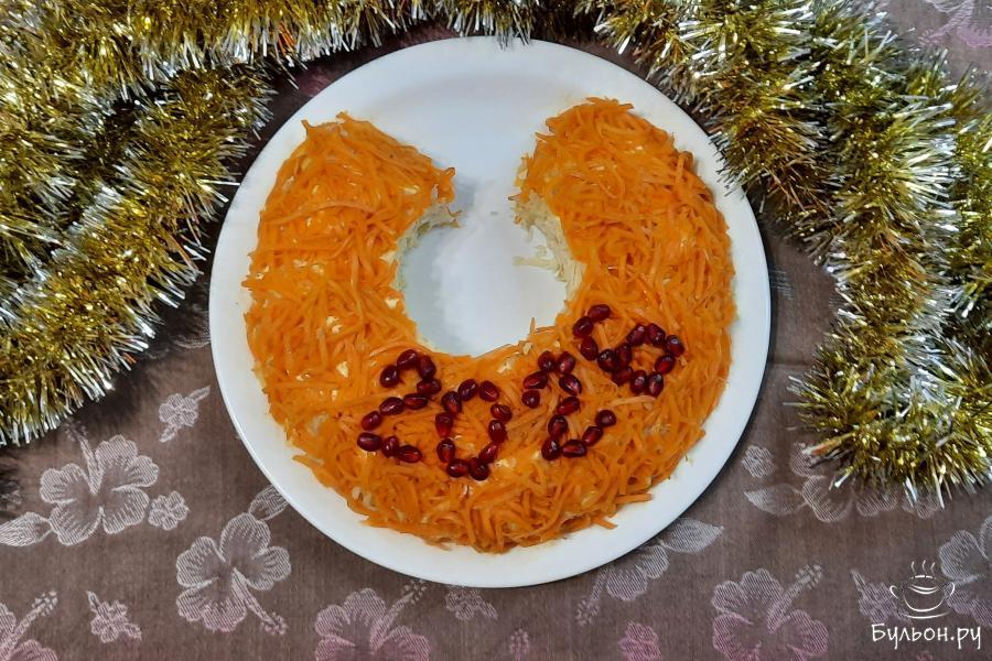 6. Украсить салат зернами граната, выложив цифры наступающего года. Салат убрать в холодильник минимум на 2 часа, чтобы пропитался. Новогодний салат "Подкова" готов. Всем счастливого Нового года!