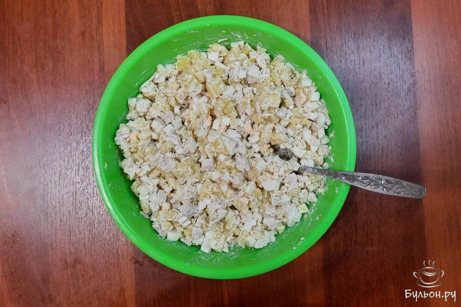 1. Куриную грудку, яйца и картофель отварить до готовности и остудить. Грудку нарезать кубиками. Овощи почистить и нарезать кубиками тоже. В миску положить картофель, куриную грудку и яйца.