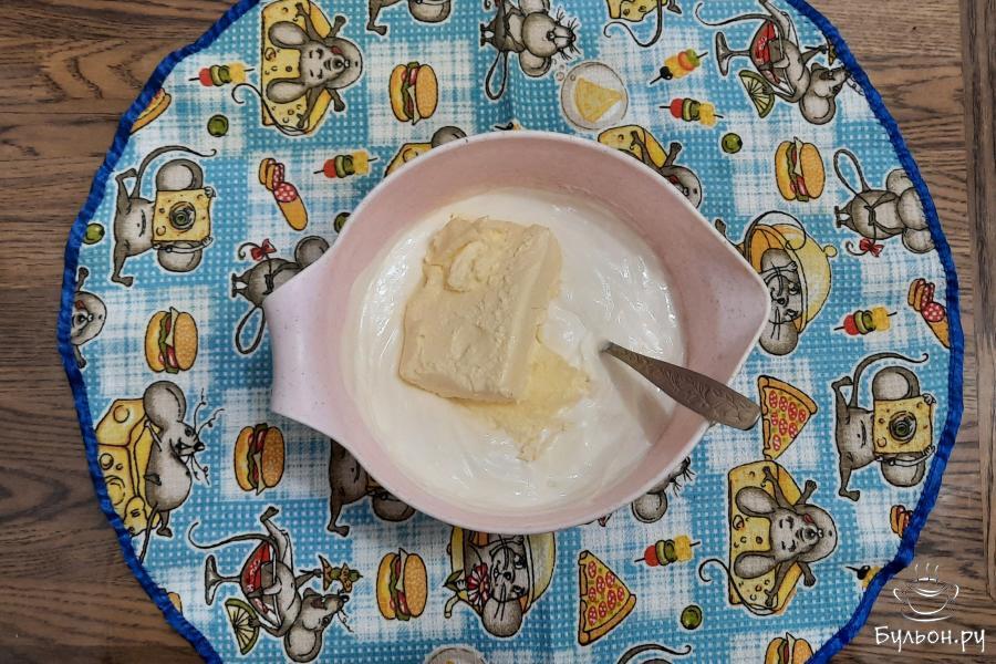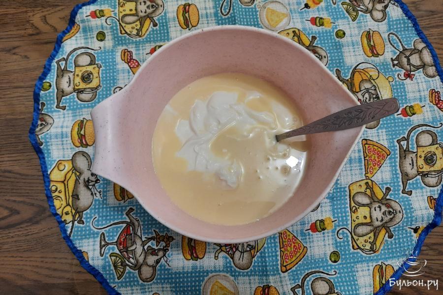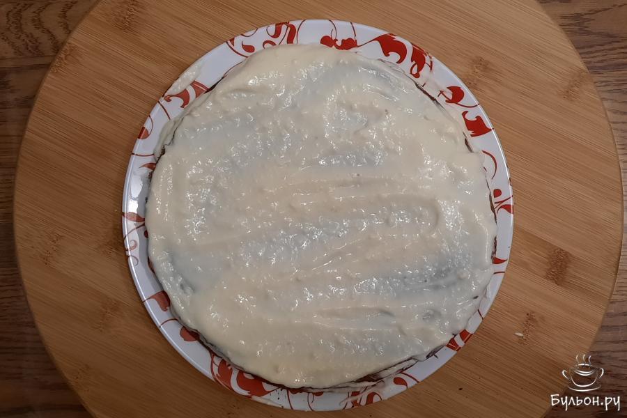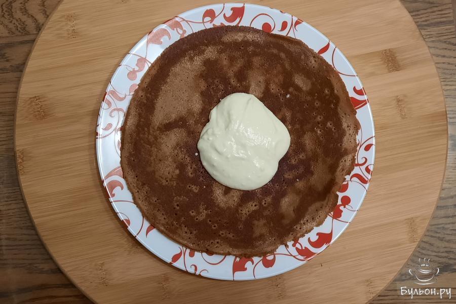 11. Ложкой распределить крем по всему блину. Затем снова блин и сверху крем, блин - крем. И так далее, пока не закончатся блины.