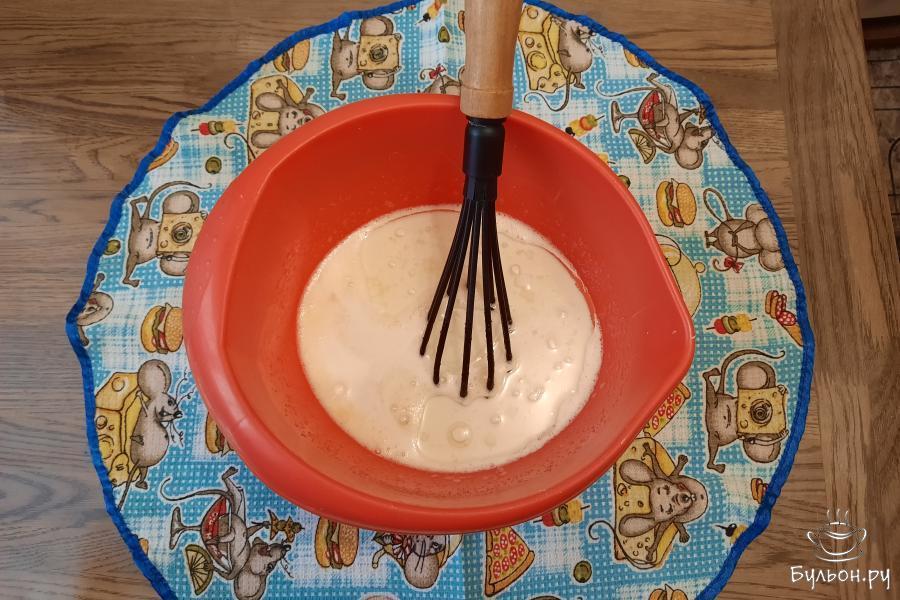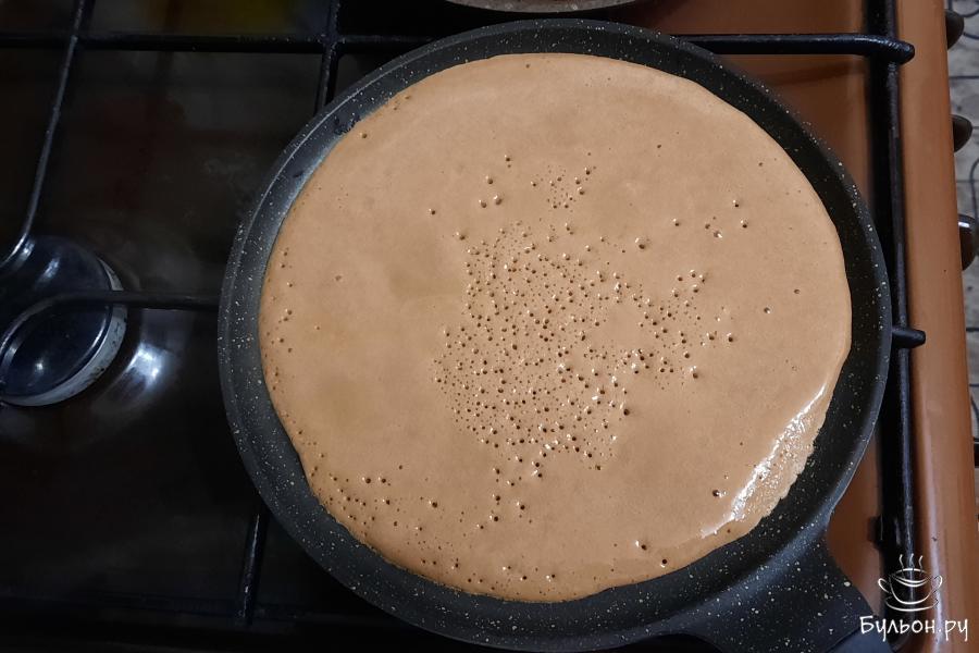 5. Сковороду разогреть, смазать растительным маслом, налить черпак теста, распределить по сковороде и выпекать до готовности низа. Будьте осторожны! Когда блин горячий, он мягкий и нежный. При остывании блин становится хрупким.