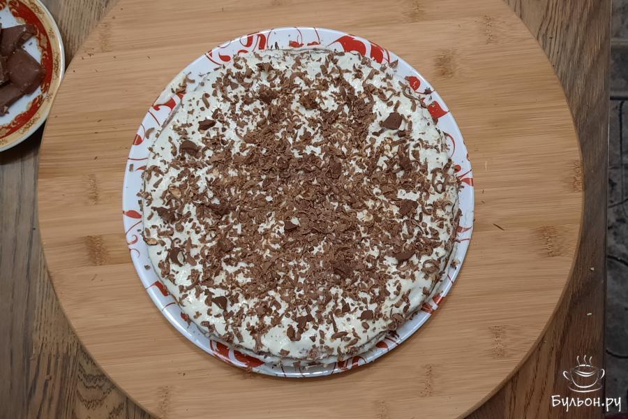 12. Верхний блин покрыть кремом и украсить шоколадной крошкой и кусочками шоколада. Вы можете украсить по своему желанию. Торт из шоколадных блинов готов. Счастливого вам вечера!