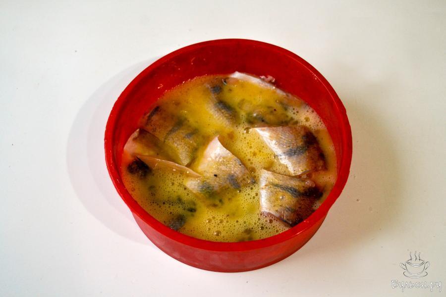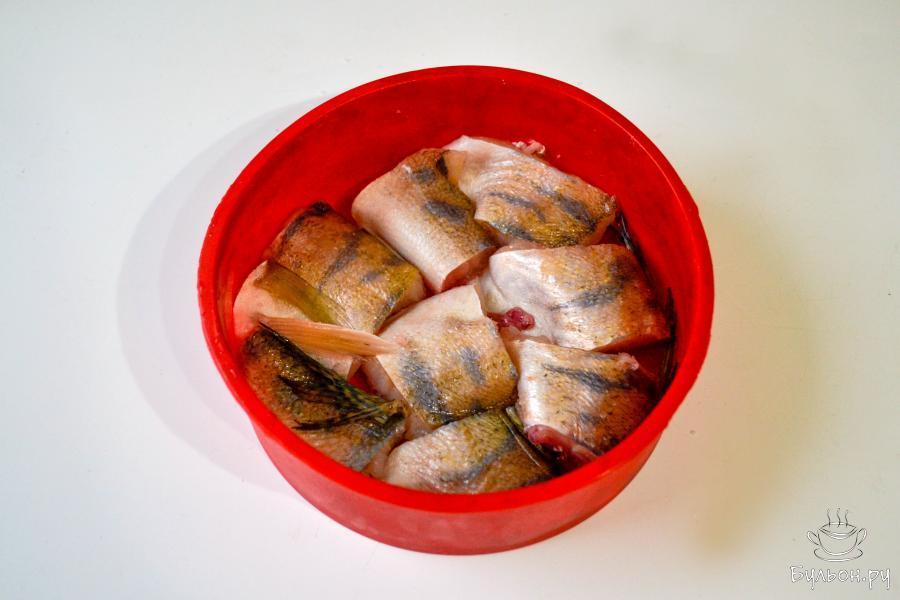 1. Рыбу почистите от чешуи, распорите брюшко, удалите внутренности, отрежьте голову, хвост и плавники. Промойте тушку и нарежьте кусочками, посолите.