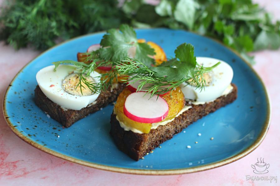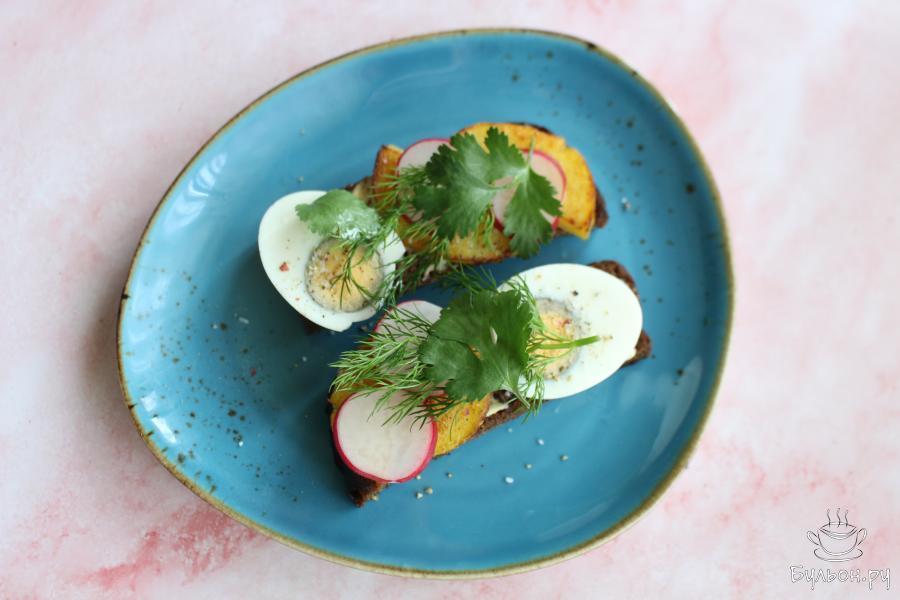 7. Редис нарезать тонко и выложить по несколько кружочков редиса на бутерброды. Украсить бутерброды свежей зеленью.