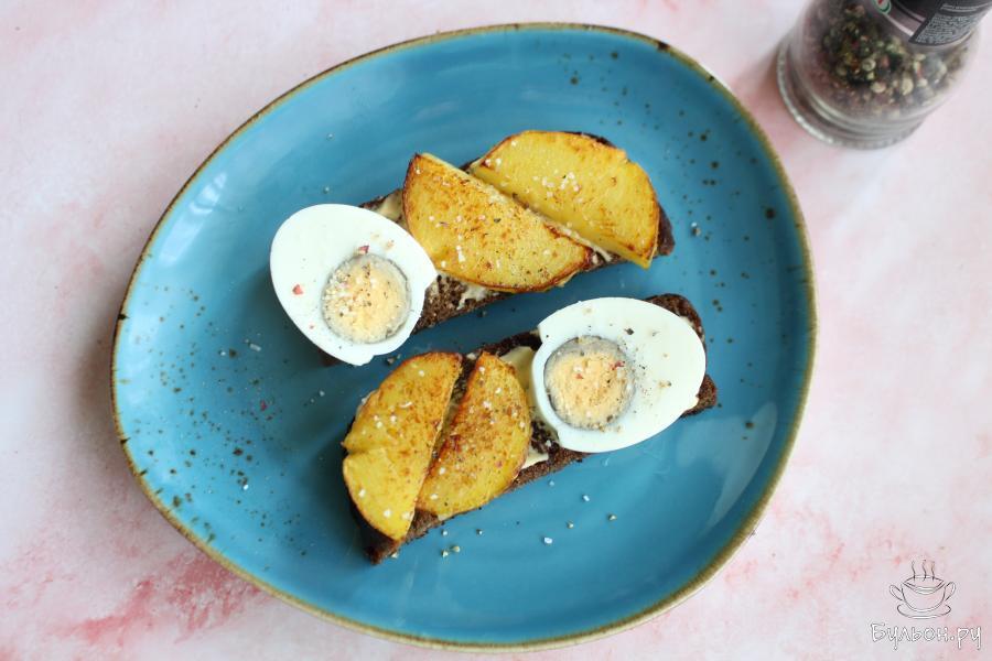 Бутерброды с жареной картошкой и вареным яйцом хорошо готовить если, например: осталась одна вареная картофелина и ее нужно использовать. Если же вареной картошки нет, то бутерброды будут готовиться дольше, так как картошку нужно будет сварить. Хотя можно картошку сразу поджарить, но будет другой вкус. Эти бутерброды получаются вкусные, сытные, яркие и очень аппетитные. Такие бутерброды можно всегда дополнить и другими свежими овощами, любимой зеленью, а в майонез можно добавить немного горчицы. Хлеб для приготовления подойдет любой, который вам хочется.