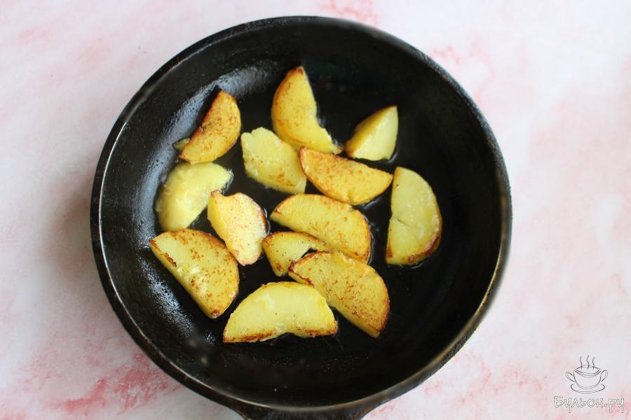4. Картошку нарезать полудольками и обжарить картошку до золотистой корочки на сковороде с разогретым маслом.
