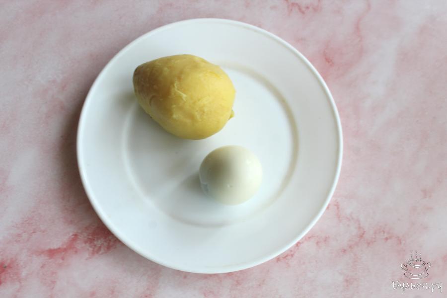 1. Картошку сварить в мундире до готовности, яйцо сварить вкрутую 10 минут после закипания воды. Остудить и почистить картошку и яйцо.