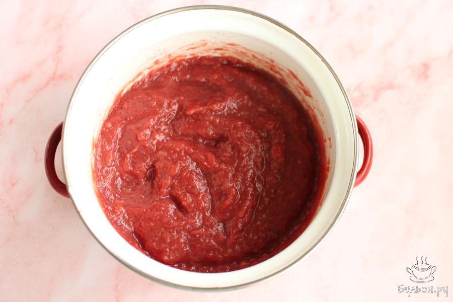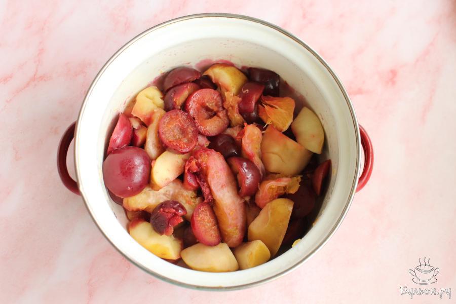 4. Поставить посуду на небольшой огонь. Варить фрукты до мягкости, сразу начинать помешивать, чтобы фрукты дали сок.