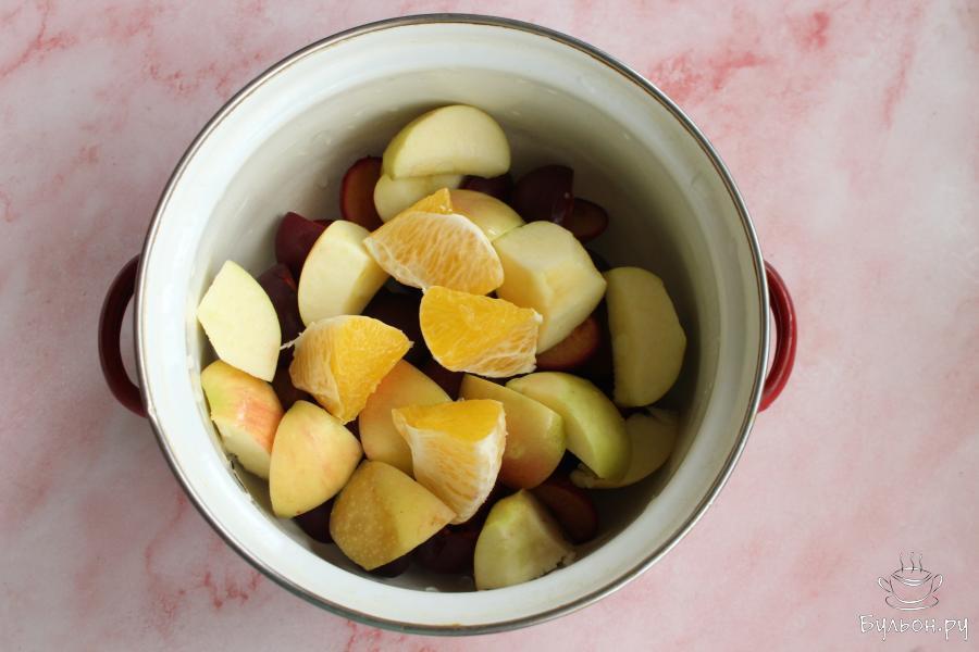 3. Яблоки почистить от сердцевинок, а апельсин почистить от кожуры и разобрать на дольки. Выложить в посуду яблоки и апельсиновые дольки.
