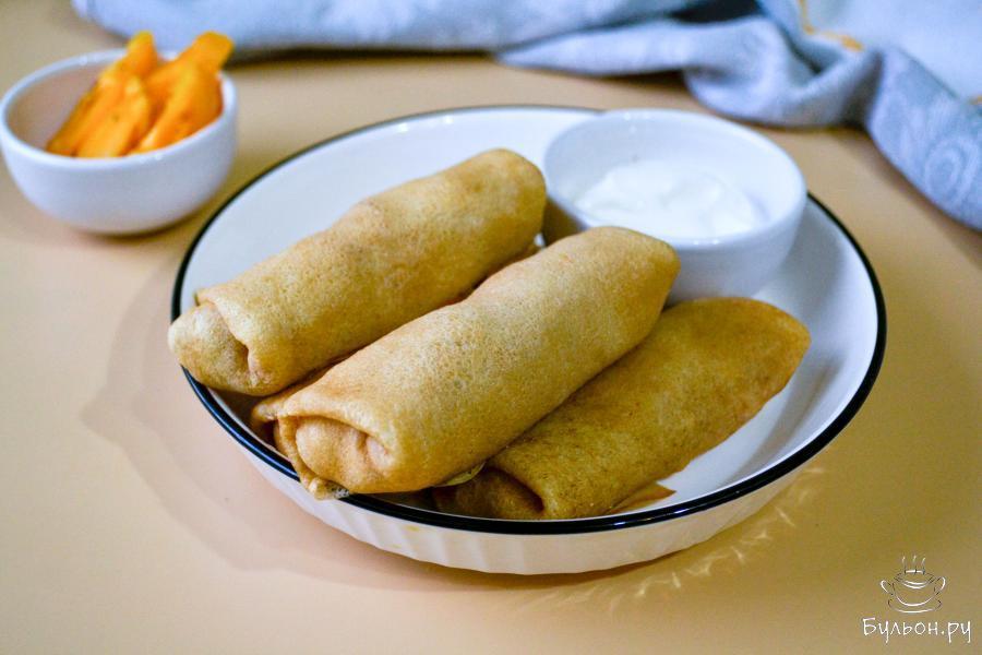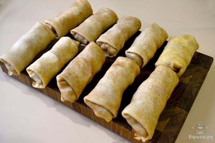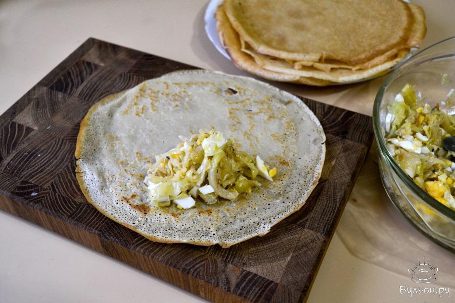 Фаршированные блины можно приготовить на постном тесте, без яиц, а яйца использовать для приготовления других блюд, которые без них не сделать. Если вы придерживаетесь поста, то начинку также можно сделать постную, без вареных яиц. Тесто на блины заваривается кипятком, благодаря этому оно прекрасно печется, при переворачивании блин не рвется. Блинчики получаются сытные, вкусные, просто идеальный вариант для семейного завтрака или обеда.