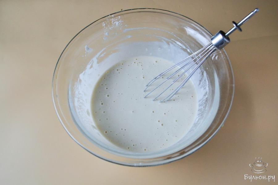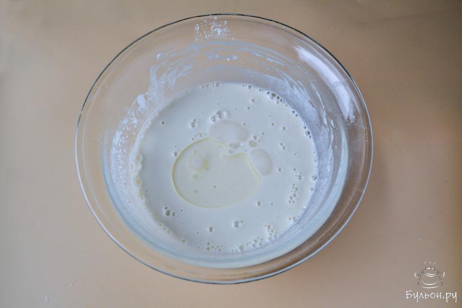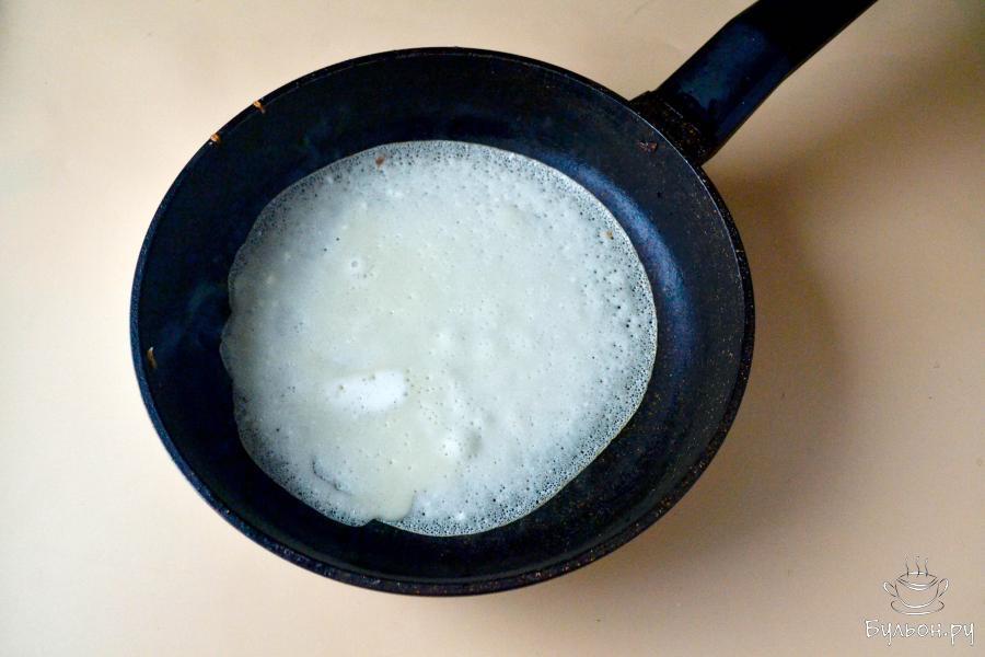 10. Для приготовления блинов раскалите сковороду. Перед выпечкой первого блина смажьте сковороду растительным маслом и вылейте порцию теста тонким слоем.
