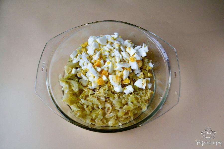 9. Тушеную капусту охладите, переложите в миску. Добавьте вареные яйца, нарезанные мелким кубиком. Перемешайте. Если необходимо, то посолите.