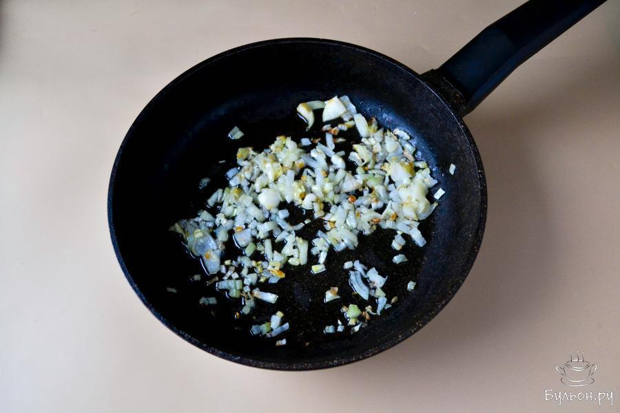 6. На горячую сковороду с растительным маслом положите нарезанный репчатый лук. Помешивая, обжарьте лук 3-4 минуты на среднем огне.