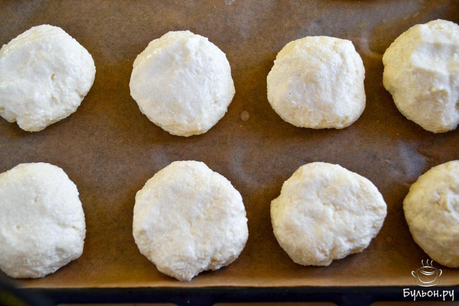 5. Смачивая руки в воде или в растительном масле, сформуйте небольшие лепешки, положите их на пекарскую бумагу, слегка приплюснув сверху.