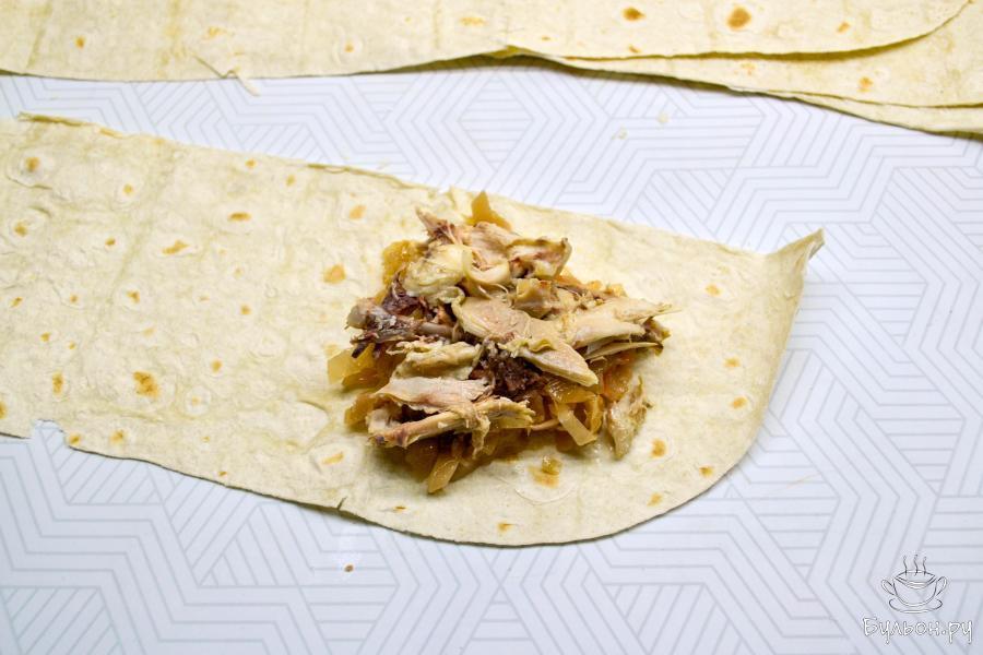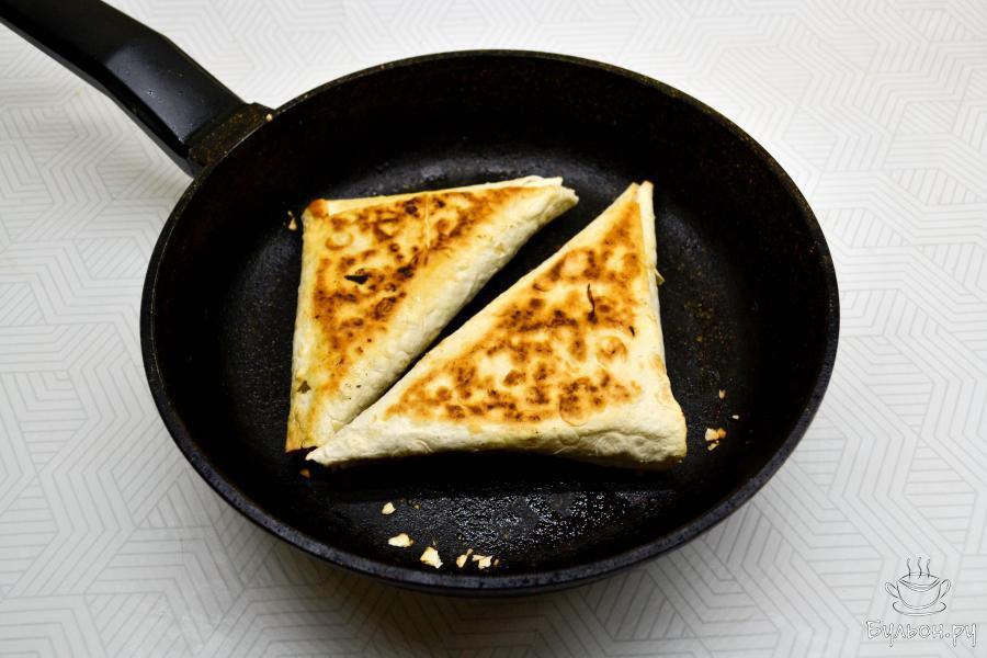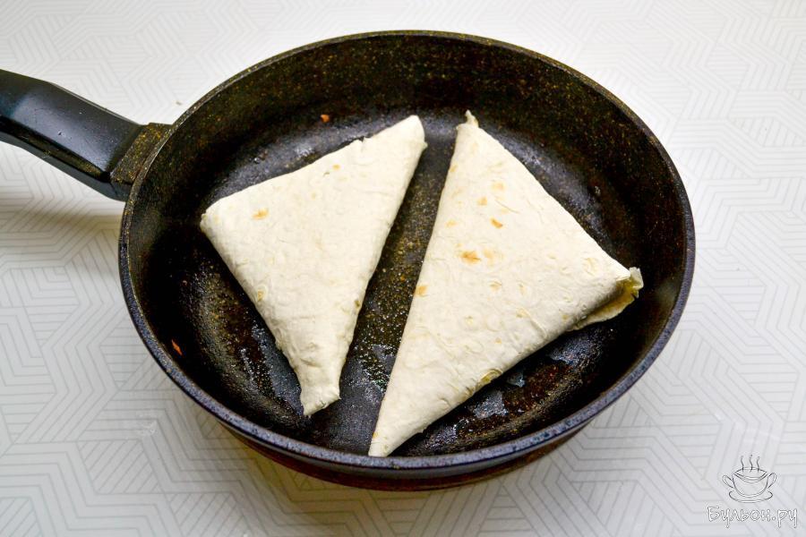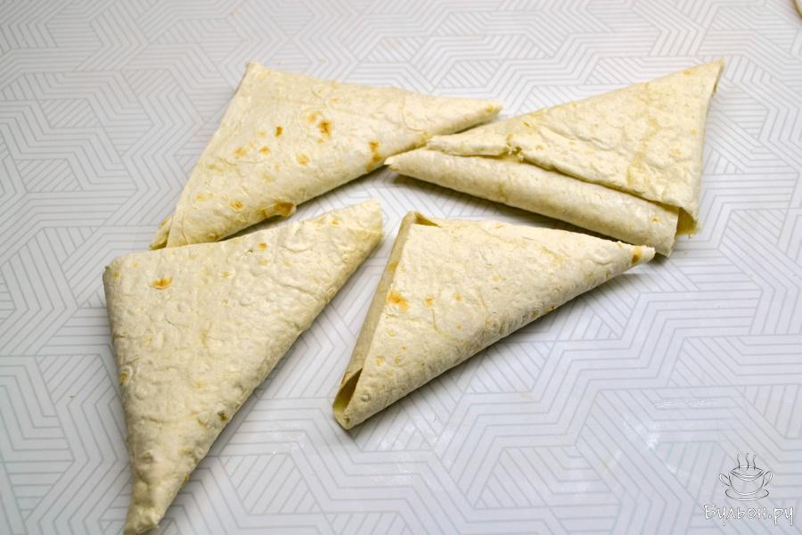 6. Затем заверните лаваш так, чтобы получился треугольник. Приготовьте такие же треугольники из всего лаваша и начинки.