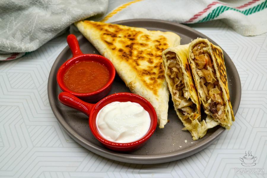 Тонкий лаваш позволяет без особых хлопот приготовить на "быструю" руку вкусные, сытные блюда, как сладкие, так и соленые. Если у вас осталась от обеда тушеная капуста и немного вареного куриного мяса, то можно за полчаса приготовить простые, сытные и вкусные треугольники, обжаренные на сковороде. Если хотите, то перед обжаркой треугольники можно обмакнуть во взбитое яйцо. Получится еще вкуснее. Для начинки можно взять картофельное пюре с обжаренным луком, вареный рис с яйцами и зеленью, вареное мясо с корейской морковью - вариантов много и можно взять те продукты, которые уже есть готовые у вас, не обязательно специально варить и жарить.