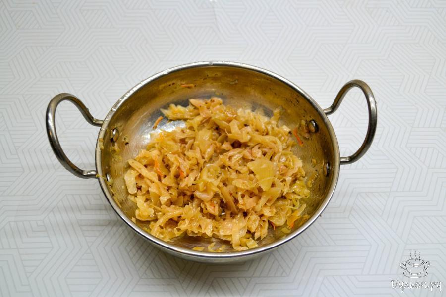 1. Для приготовления треугольников возьмите тушеную капусту. Капусту можно специально потушить или использовать ту, которая осталась от обеда.