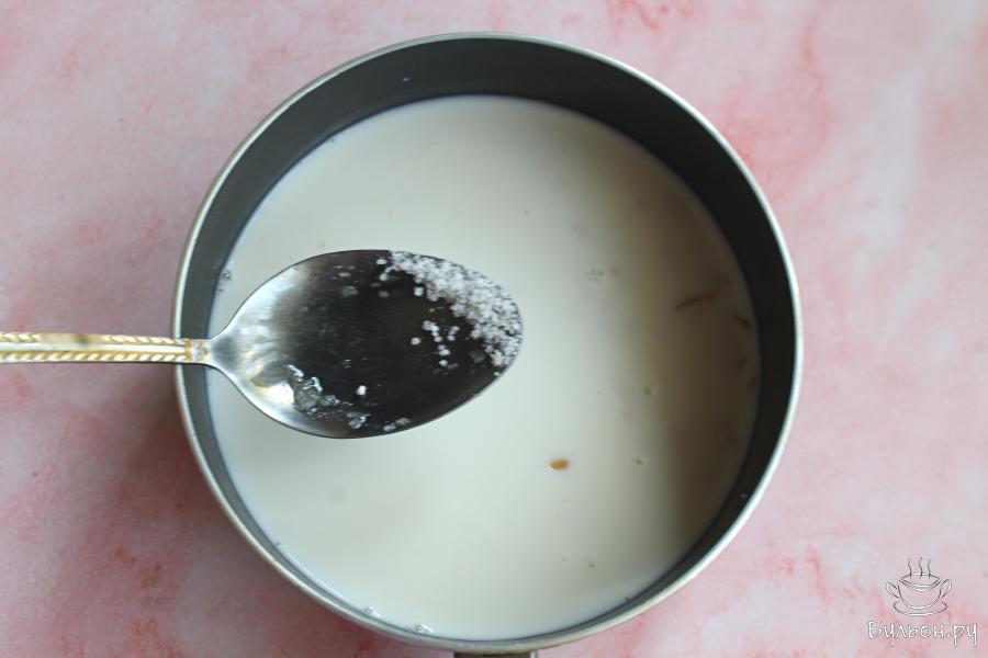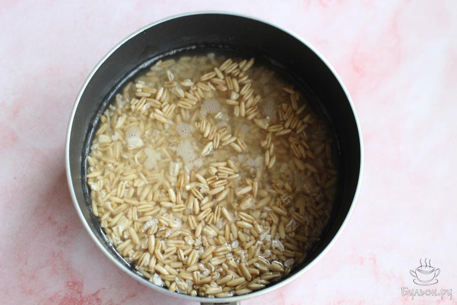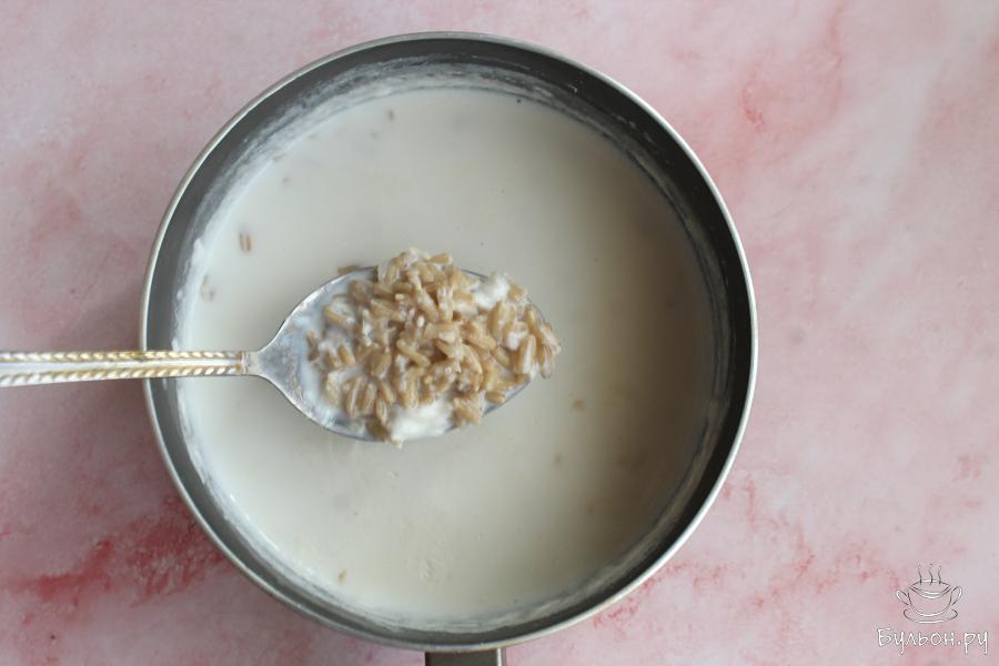 2. Когда крупа вымочится, можно готовить кашу. В сотейник налить молоко, добавить соль. С крупы слить воду и выложить овсянку в сотейник.