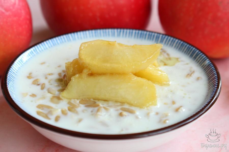Овсянка из цельного зерна с тушеными яблоками - это отличный вариант полезного, сытного и вкусного завтрака или полдника. Заранее залейте овсяное зерно водой и тогда каша будет готова очень быстро. Каша получается очень аппетитная и нежная, а сладкие тушеные яблоки будут хорошим дополнением к простому блюду. Количество сахара можно увеличить. Если вы любите более сладкие блюда, то и в саму кашу можно добавить сахар. Сливочное масло можно тоже добавить еще дополнительно и в кашу.