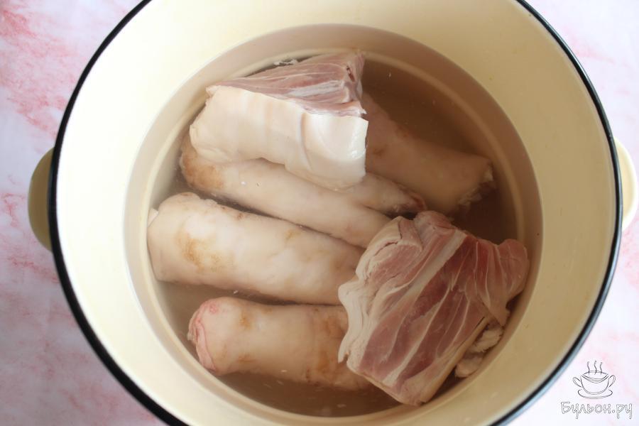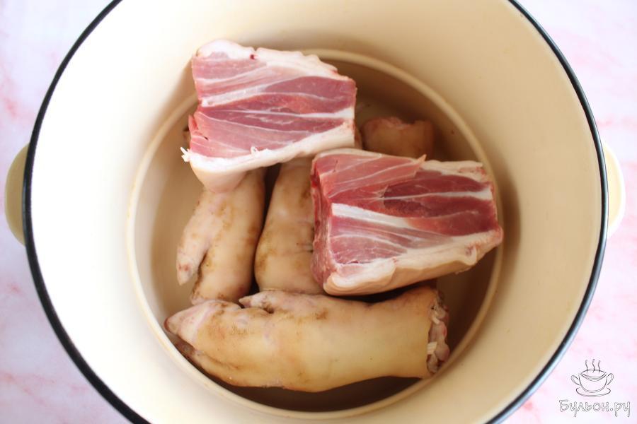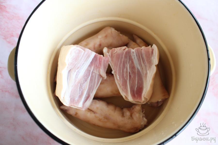 1. Ножки и рульку промыть, выложить в большую посуду и залить холодной водой. Оставить посуду на ночь.