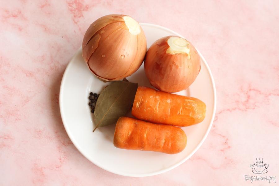 4. Морковь и лук не чистить. Морковь тщательно промыть щеткой, а у луковиц срезать корешки. Овощи нужны не только для вкуса, но и для цвета бульона, поэтому не чистим лук.