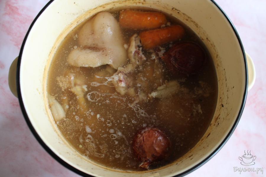 3. Залить мясо свежей водой и поставить посуду на огонь. Пенку снимать. Варить холодец под крышкой три часа на небольшом огне. Нужно, чтобы бульон кипел очень слабо.