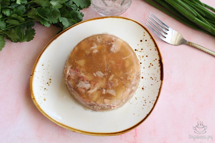 11. Убрать посуду с холодцом в холодильник до застывания. Когда холодец застынет, жир сверху можно легко убрать.