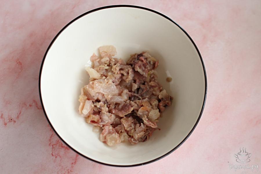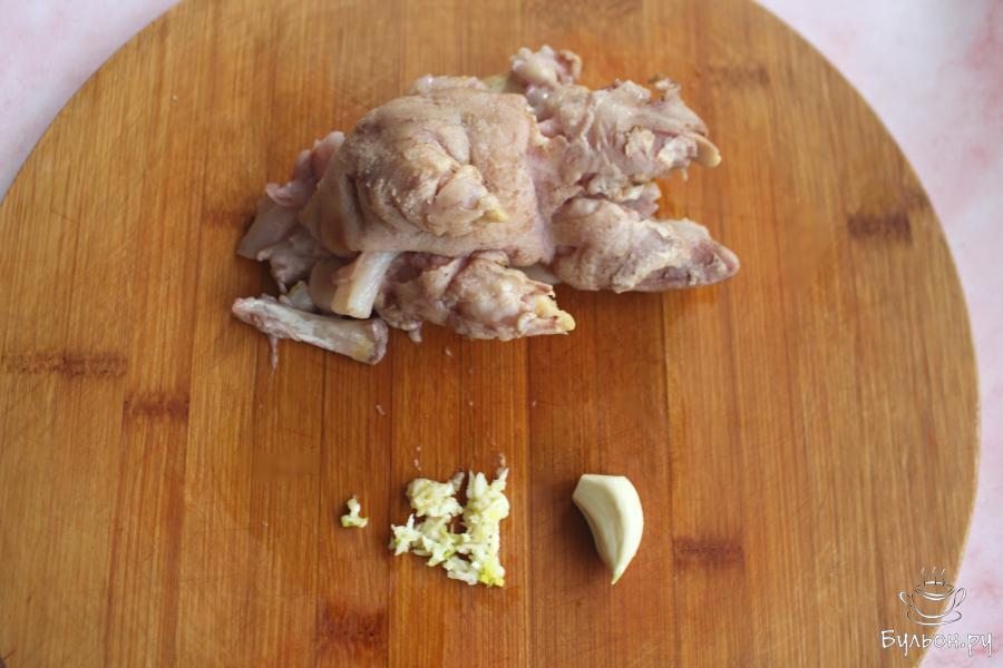 7. Ножки разобрать, убрать косточки, а мясо мелко нарезать. Чеснок продавить через пресс и перемешать с мясом.