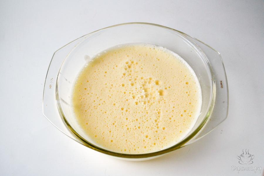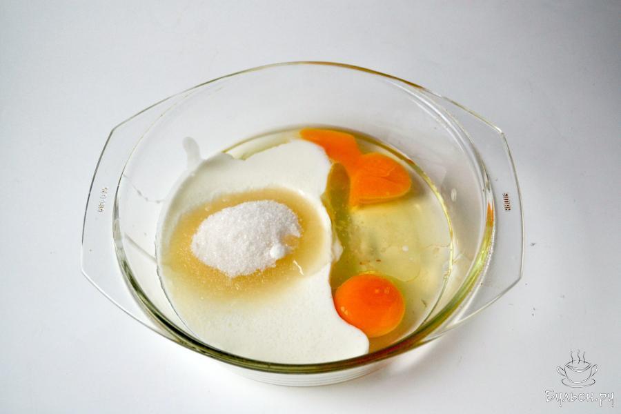 1. Разбейте в миску яйца, влейте кефир, масло растительное, добавьте сахар (3 ст. л.) и щепотку соли.