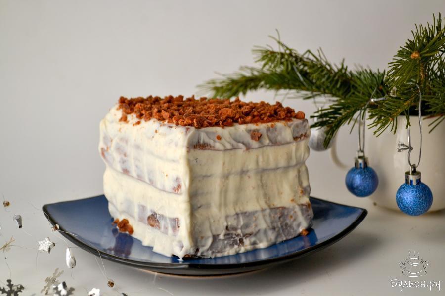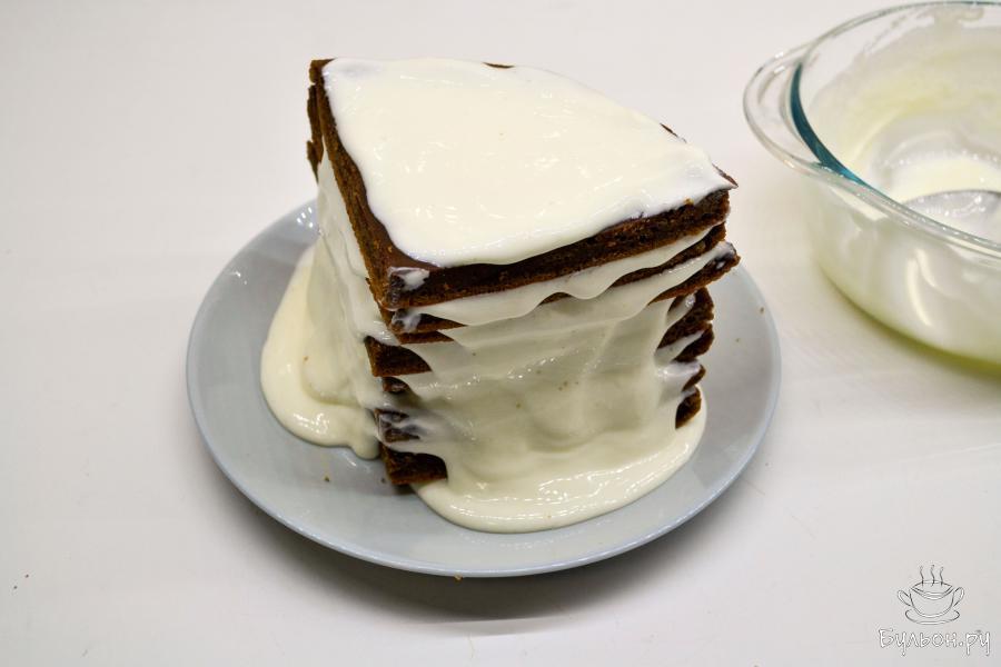 11. Соберите торт из всех коржей и крема. Кремом смажьте бока тортика. Уберите торт для пропитки в холодильник на несколько часов. Я убрала на ночь.