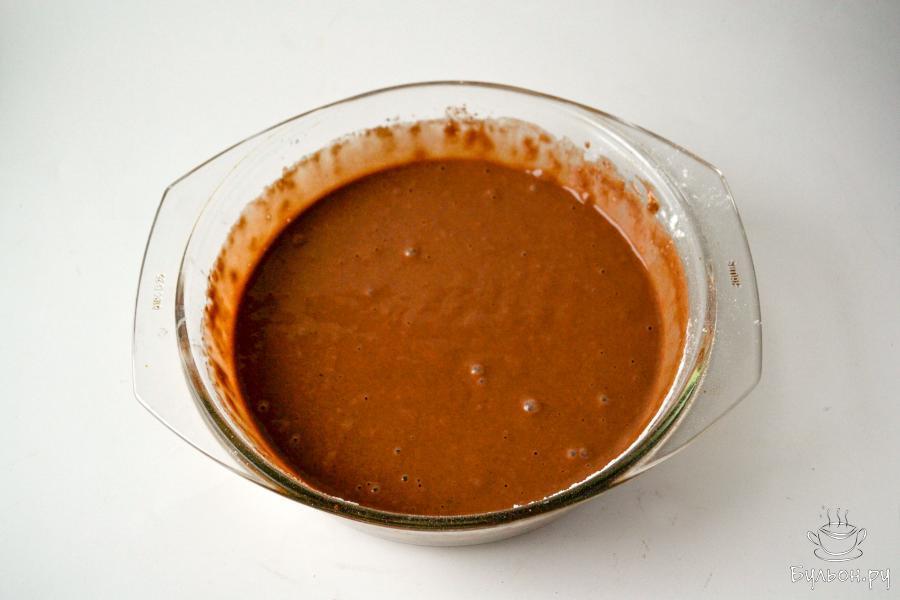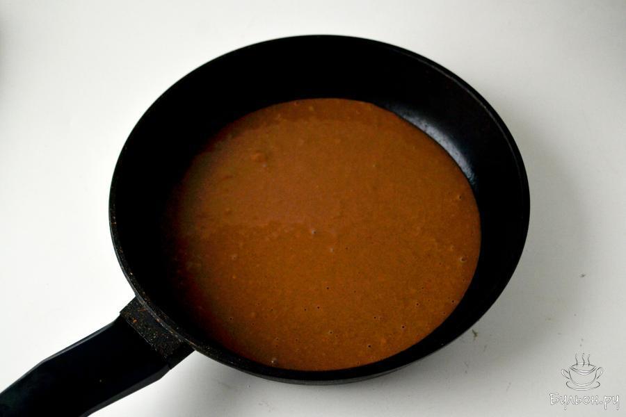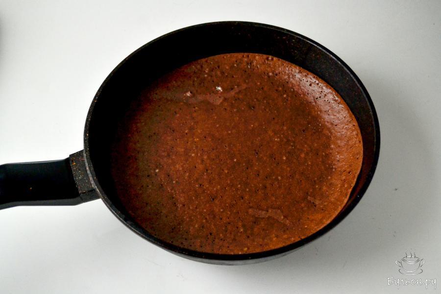 6. Под крышкой, на самом минимальном огне выпекайте корж примерно 20-25 минут. Время выпечки будет зависеть от высоты налитого теста. Из готового коржа деревянная шпажка должна выходить сухой. Снимите корж со сковороды и охладите на решетке. Испеките второй корж из оставшегося теста.