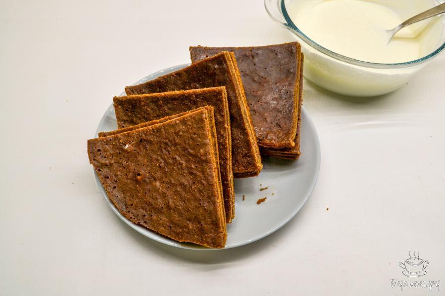 9. Испеченные коржи разрежьте на 4 части. Можно все коржи немного подрезать, чтобы получились одинакового размера, а из обрезков сделать крошку для украшения торта.