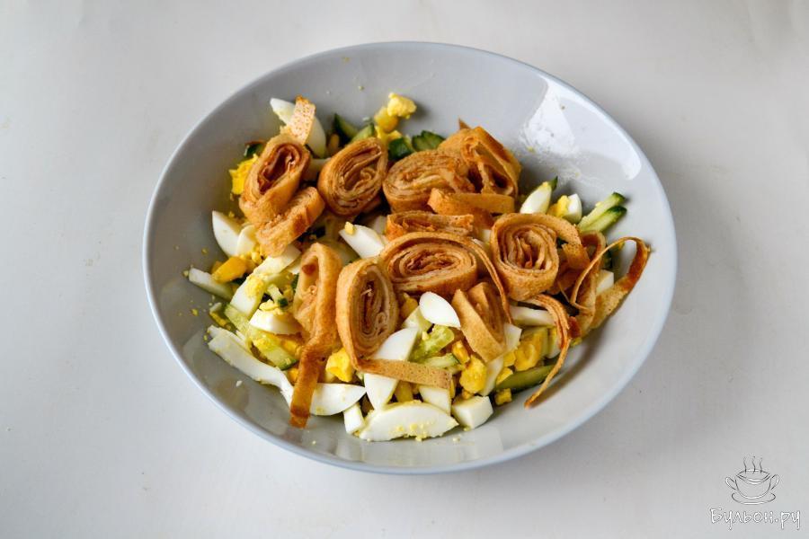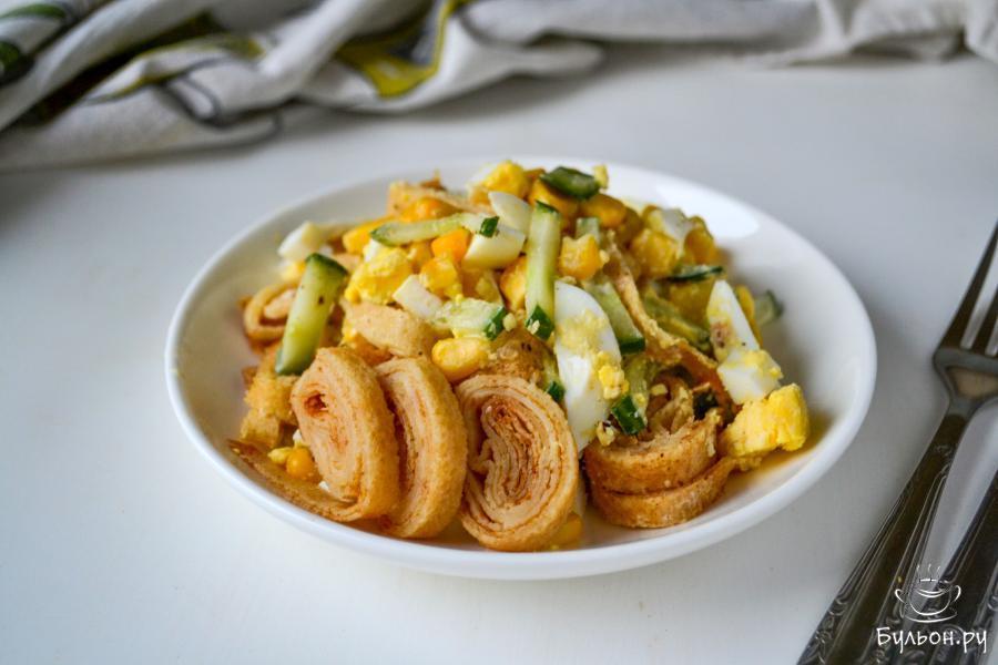 Салат с блинами можно приготовить за считанные минуты, при условии, если блины уже пожарены. А, вообще, можно взять блины, оставшиеся от завтрака или обеда, совсем не обязательно специально их жарить для салата. Вареные яйца, свежий огурец, консервированная кукуруза и блинчики, заправленные майонезом и у вас сытное, вкусное блюдо, которое можно приготовить даже для неожиданных гостей. В салат можно добавить копченую колбасу или вареное мясо, курицу, а заправить сметаной. Приготовленный салат лучше сразу подать на стол, чтобы блинчики после заправки майонезом не размокли. Из указанных ингредиентов получилась 1 большая или 2 маленькие порции салата.
