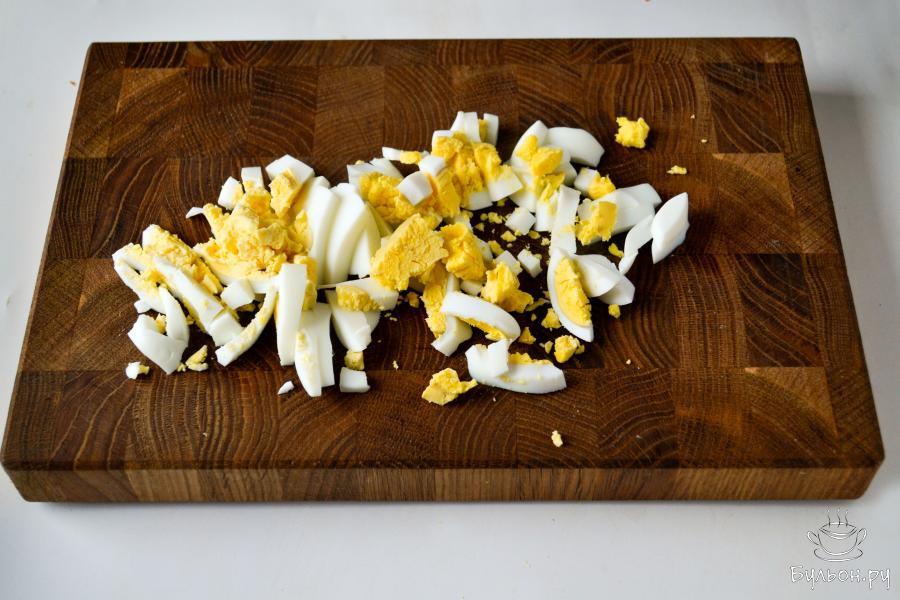 5. В глубокую тарелку или миску положите нарезанные яйца, огурец. С консервированной кукурузы слейте жидкость и добавьте ее к остальным продуктам.