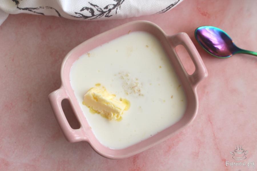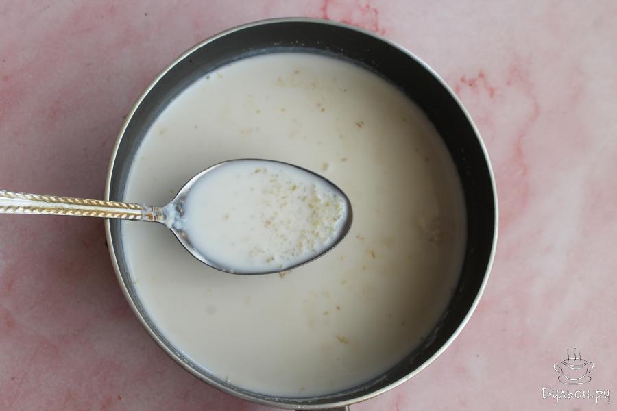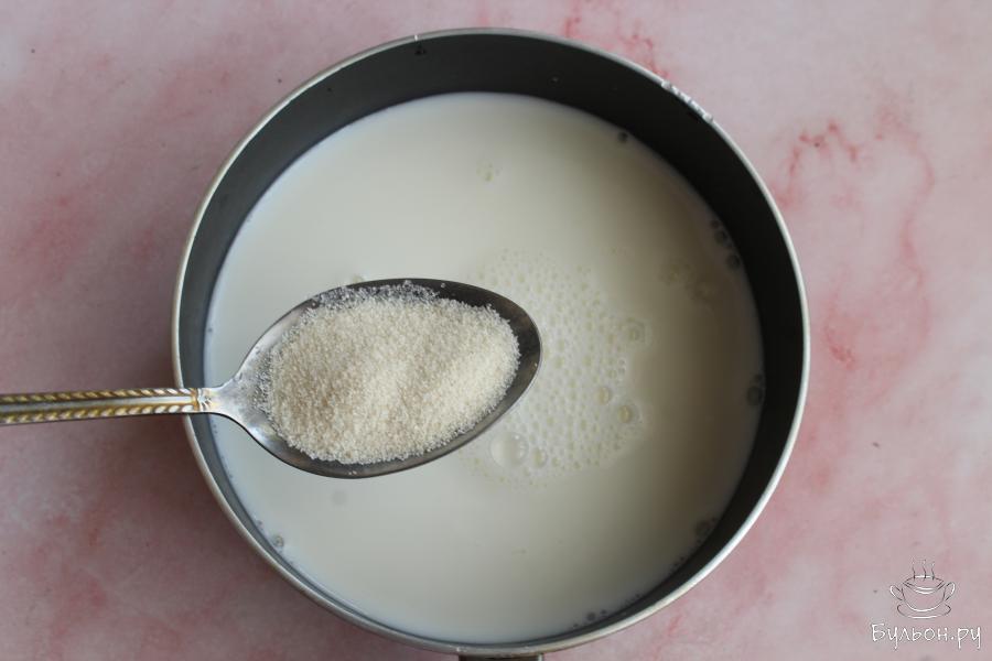 2. Влить молоко и поставить посуду на огонь. Сразу добавить манку и сразу помешивать. Довести кашу до кипения и варить кашу минуту.